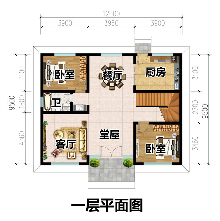 一层户型:堂屋、客厅、厨房、餐厅、卧室x2、卫生间;