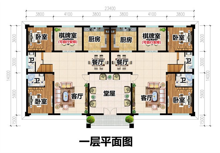 一层房屋户型:堂屋、客厅、棋牌室、厨房、餐厅、卧室(带卫生间)、卧室、卫生间;