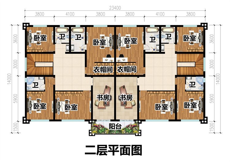 二层房屋户型:书房、卧室(带卫生间)、卧室(带卫生间、衣帽间)、卧室x2、卫生间、阳台;
